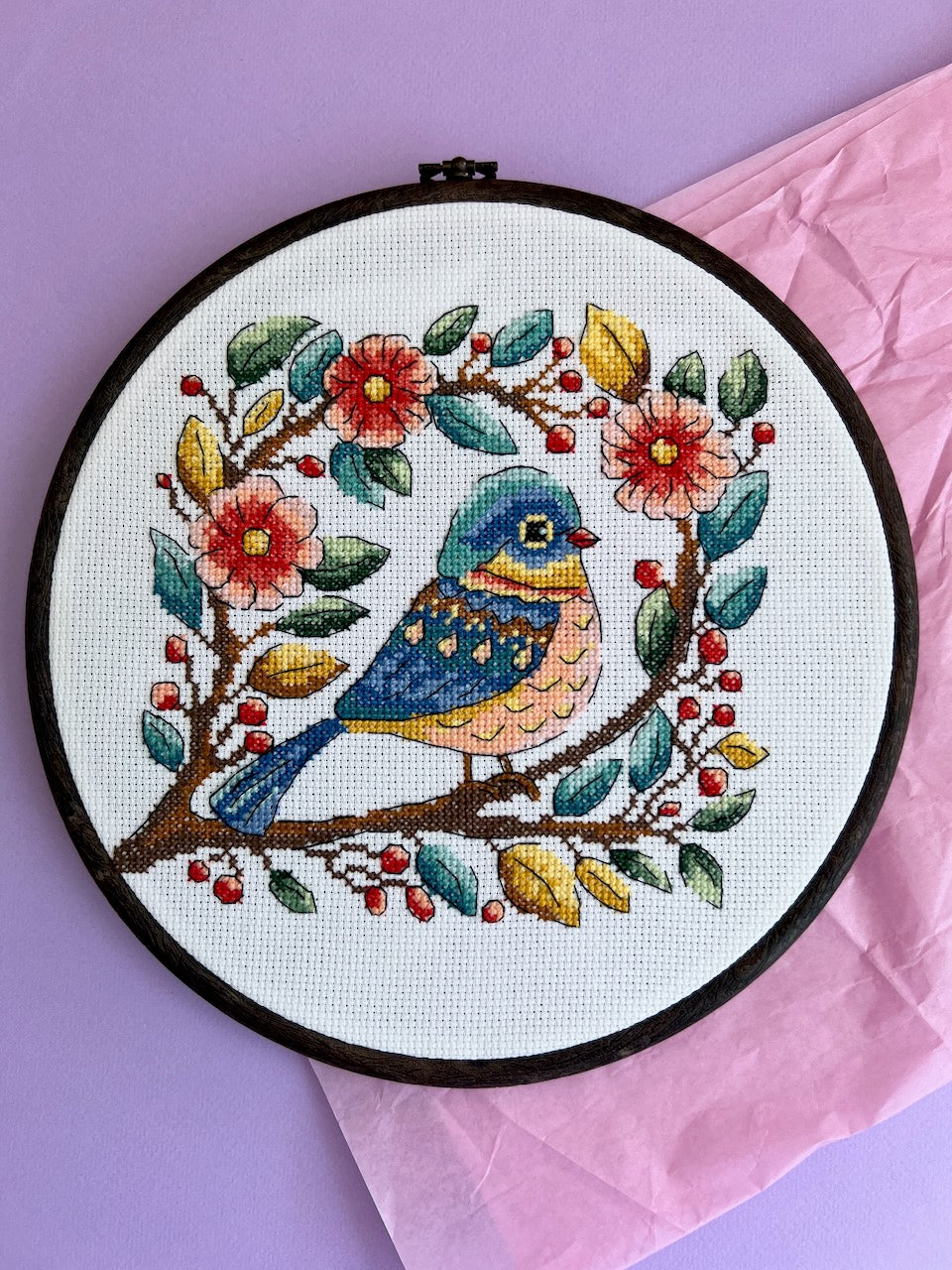 This cross stitch pattern features a charming blue bird surrounded by delicate flowers, designed for easy embroidery. Ideal for stitchers seeking a delightful yet straightforward project, it combines clear, expert-level instructions with a playful motif that adds a touch of whimsy to any creation. Perfect for enhancing home décor or personal accessories with a handcrafted touch.