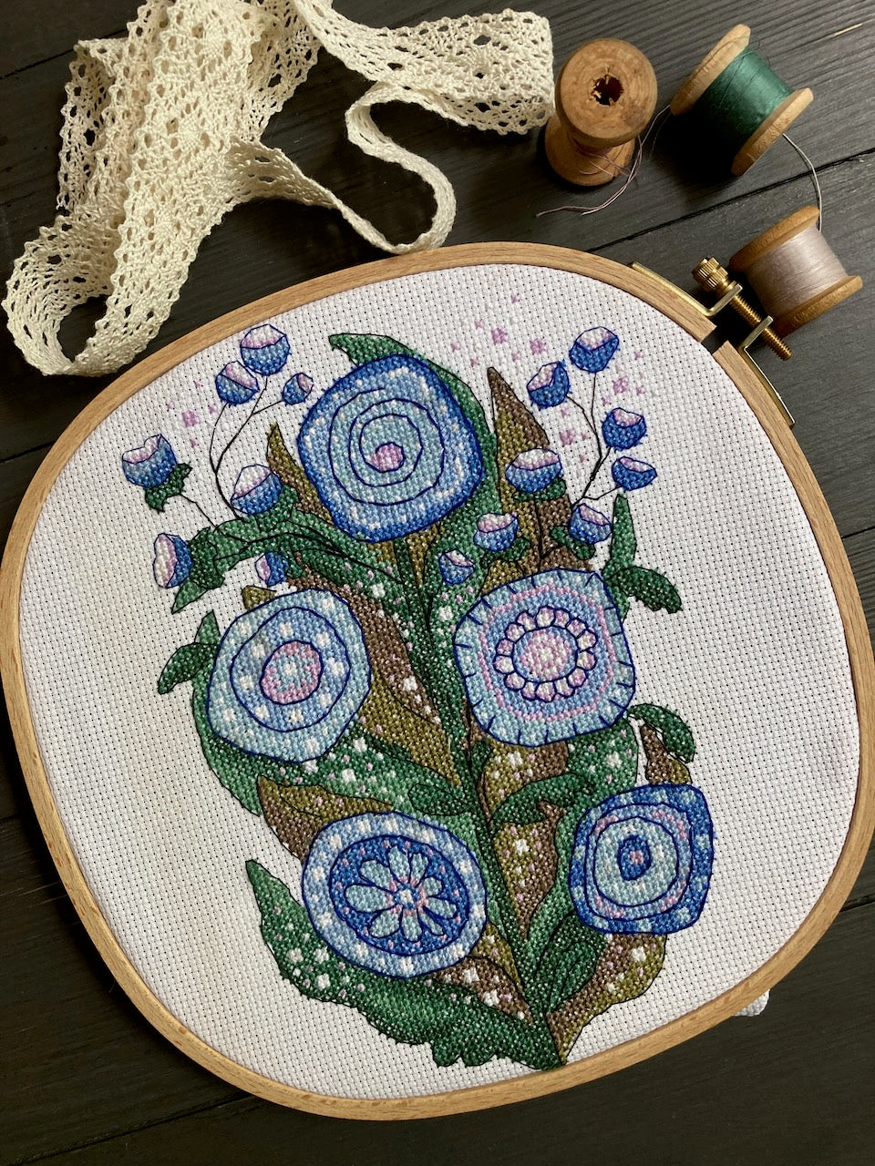 This Blue Folk Flowers cross stitch pattern is perfect for primitive embroidery. Its simple design includes blue folk flowers and bright dark green leaves. The embroidery pattern is designed with simple symbols, so the process will be easy and bring good emotions. The pattern uses only crosses and a little backstitch.