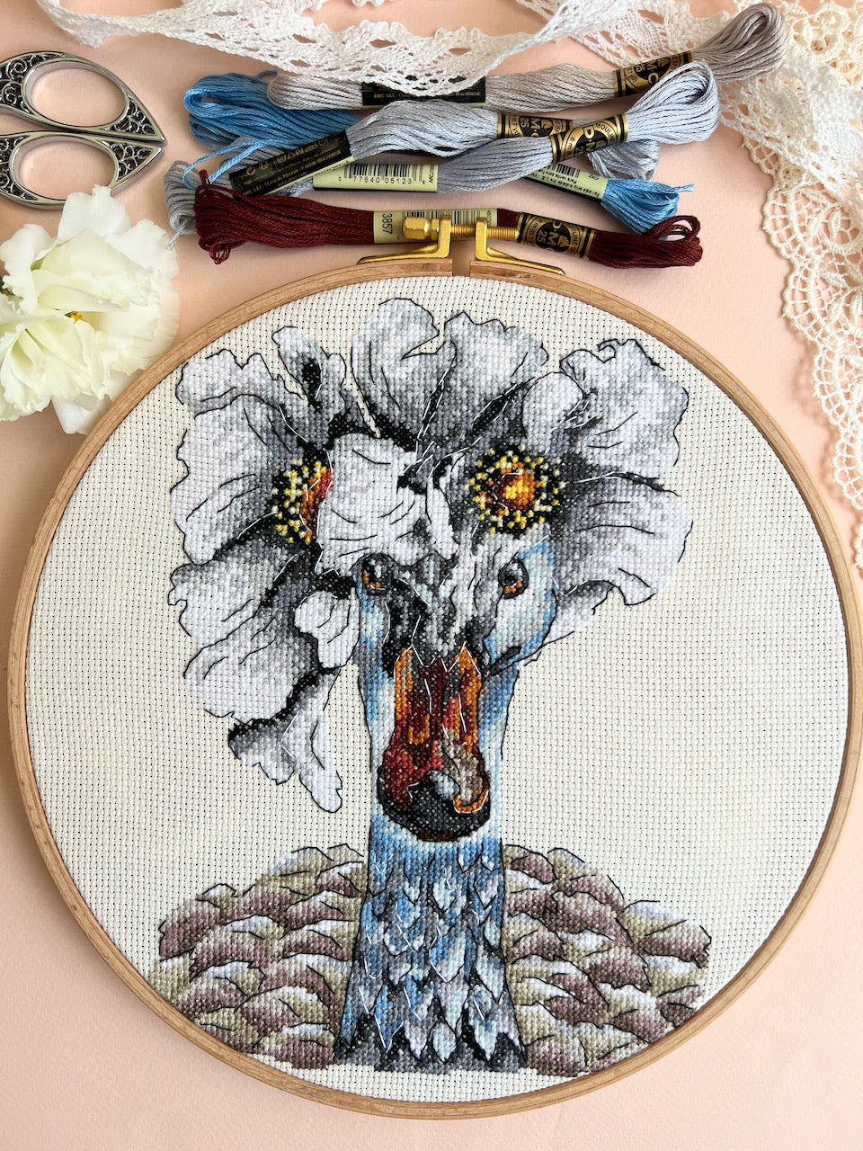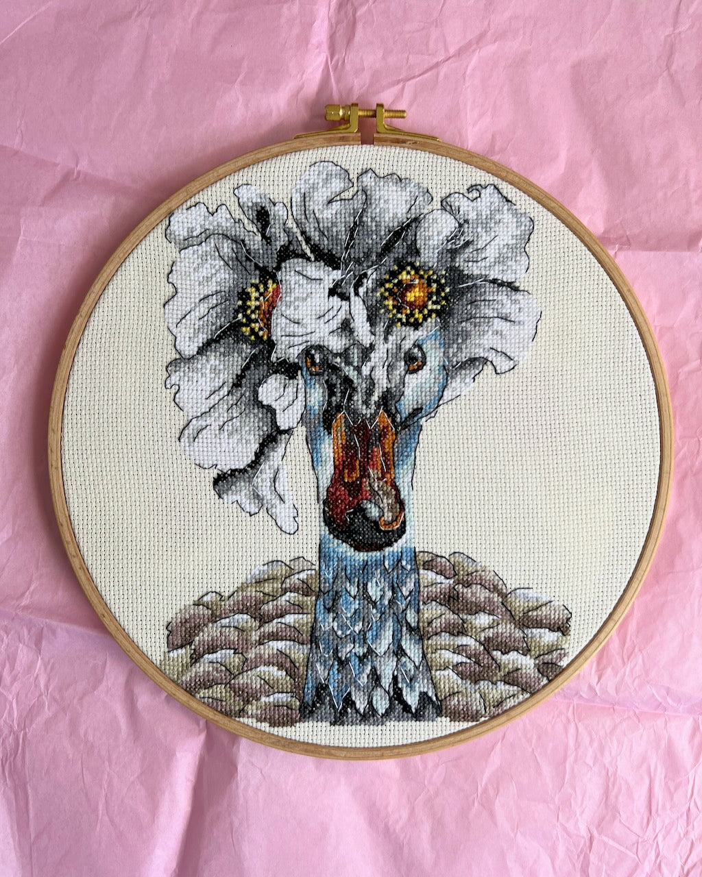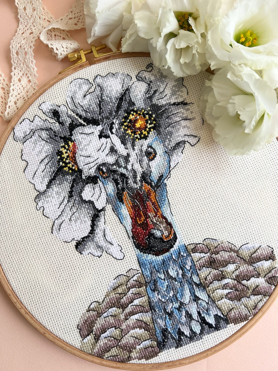 This modern cross stitch pattern features a whimsical goose surrounded by white, oversized flowers. The pattern is designed for easy and enjoyable embroidery, making it a fun addition to any craft collection. Bring a touch of humor and nature into your cross stitch projects with this delightful design.