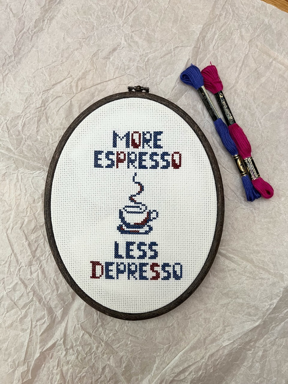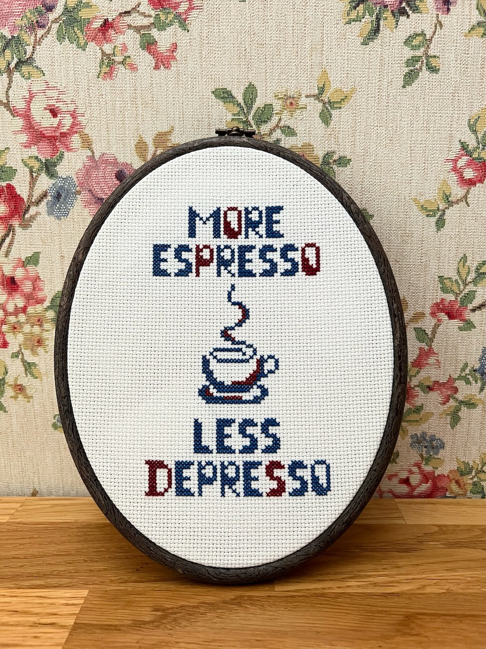 This funny cross stitch pattern, More Espresso - Less Depresso, is perfect for bringing a dose of caffeine joy to any space. Offering an easy-to-stitch pattern and bold lettering, this is ideal for any coffee lover with basic-level cross stitching skills. Add this fun poster to your home for a little pick-me-up every day!